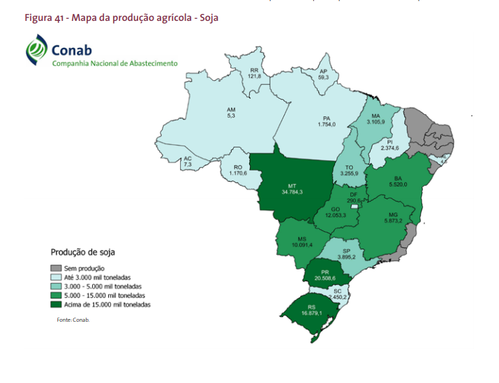 A safra 2023/2024 o Brasil alcançou 147.718 milões de toneladas de produção, apesar de aumento na area de plantio a produtividade ficou abaixo da temporada 22/23. O Consumo interno de soja em grão foi de 56.00 milões de toneladas e as exportações em 99.00 milhoes de toneladas.